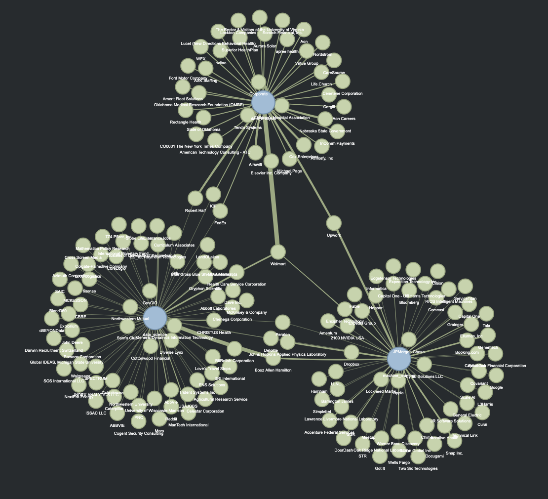 Future work on this analysis involves three steps. One challenge encountered through this process was the small sample size of data because of the angle taken to analyze data analysis, data science, and machine learning specifically. Therefore, the first would be to expand the dataset to include at least 100 (ideally 500) query results for each of the three roles isolated in this project. The second step would be to research further how to add filters to each figure to create even more informative visualizations. For instance, add an additional layer to the network graph so a user can filter by location and observe any data analysis, data science, and machine learning location and company trends. The final step involves the creation of a dashboard with similar visualizations that pulls the latest job search data on a timed cadence and is made public to DSAN students. Although the DSAN program and Georgetown have excellent career resources, a current visual dashboard would be a unique addition to our program.